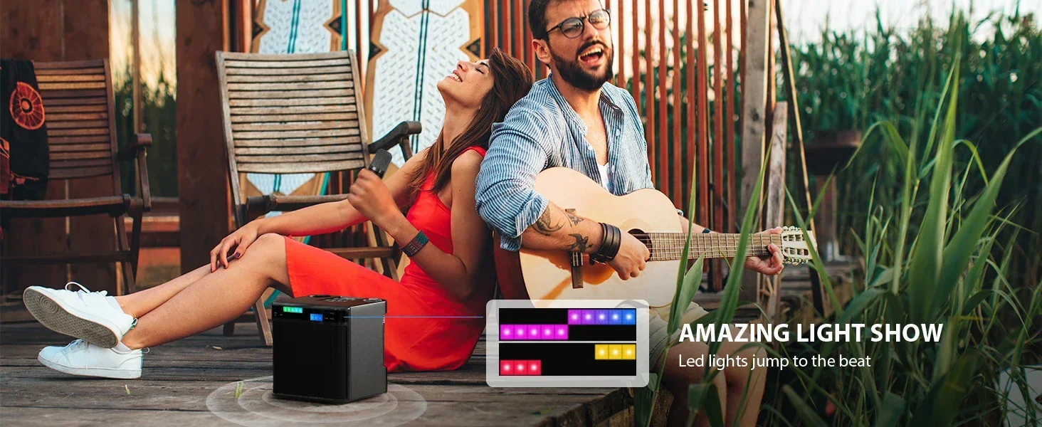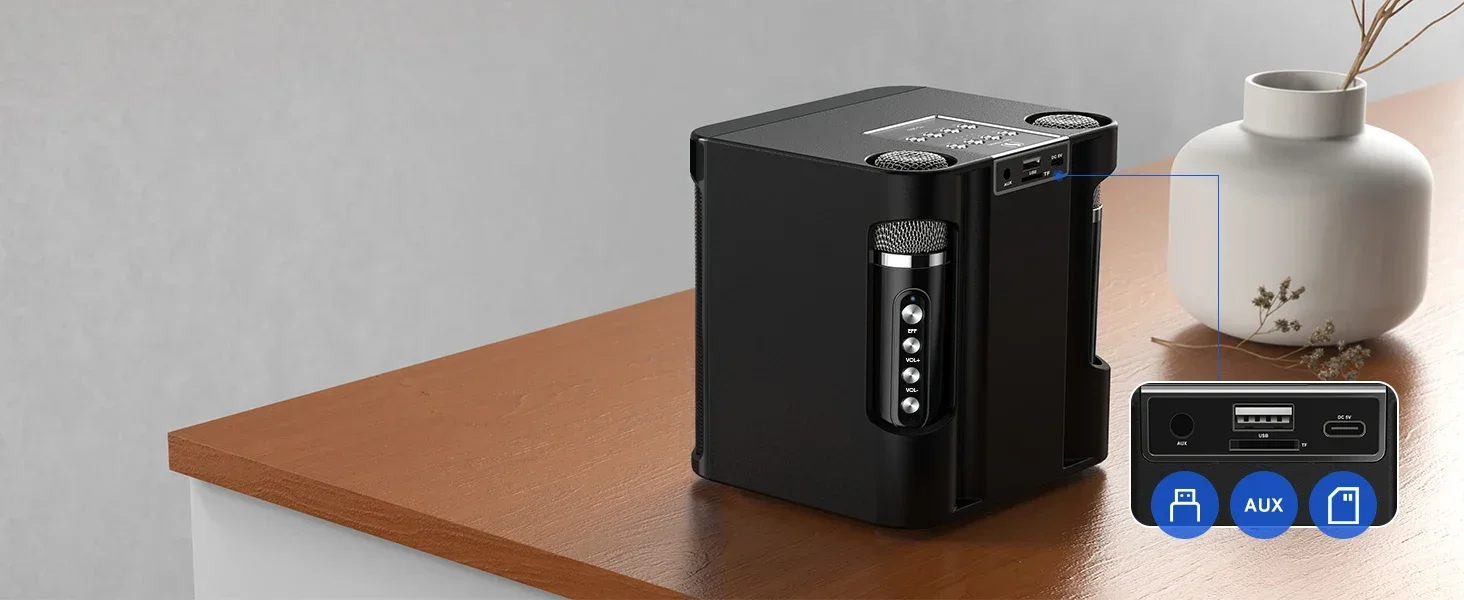 �� 【Long life】 : This karaoke speaker has a 3000mAh high-efficiency lithium-ion battery, which guarantees uninterrupted music playing for up to 8 hours at 50% volume, and a 1500mAh high-efficiency lithium-ion battery with built-in microphone. In addition, the speaker can be used as a charging station, and the USB port can charge the smartphone.