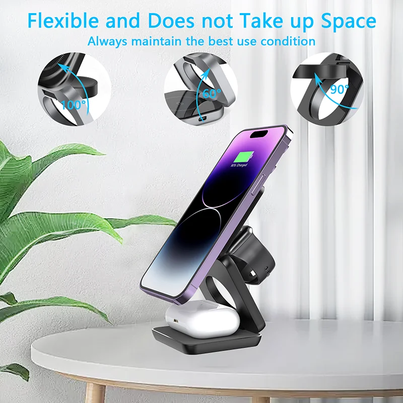 3 in 1 Magnetic Foldable Wireless Charger Stand for iPhone 15 14 13 12 Apple Watch 8 7 Airpods Pro Fast Charging Dock Station