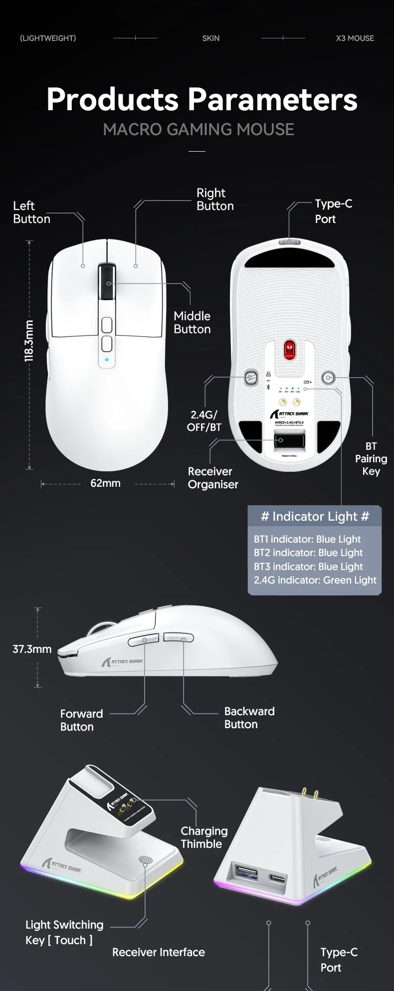 Magnetic charging base with exclusive RGB light ring, support multiple light effects switching with one key.