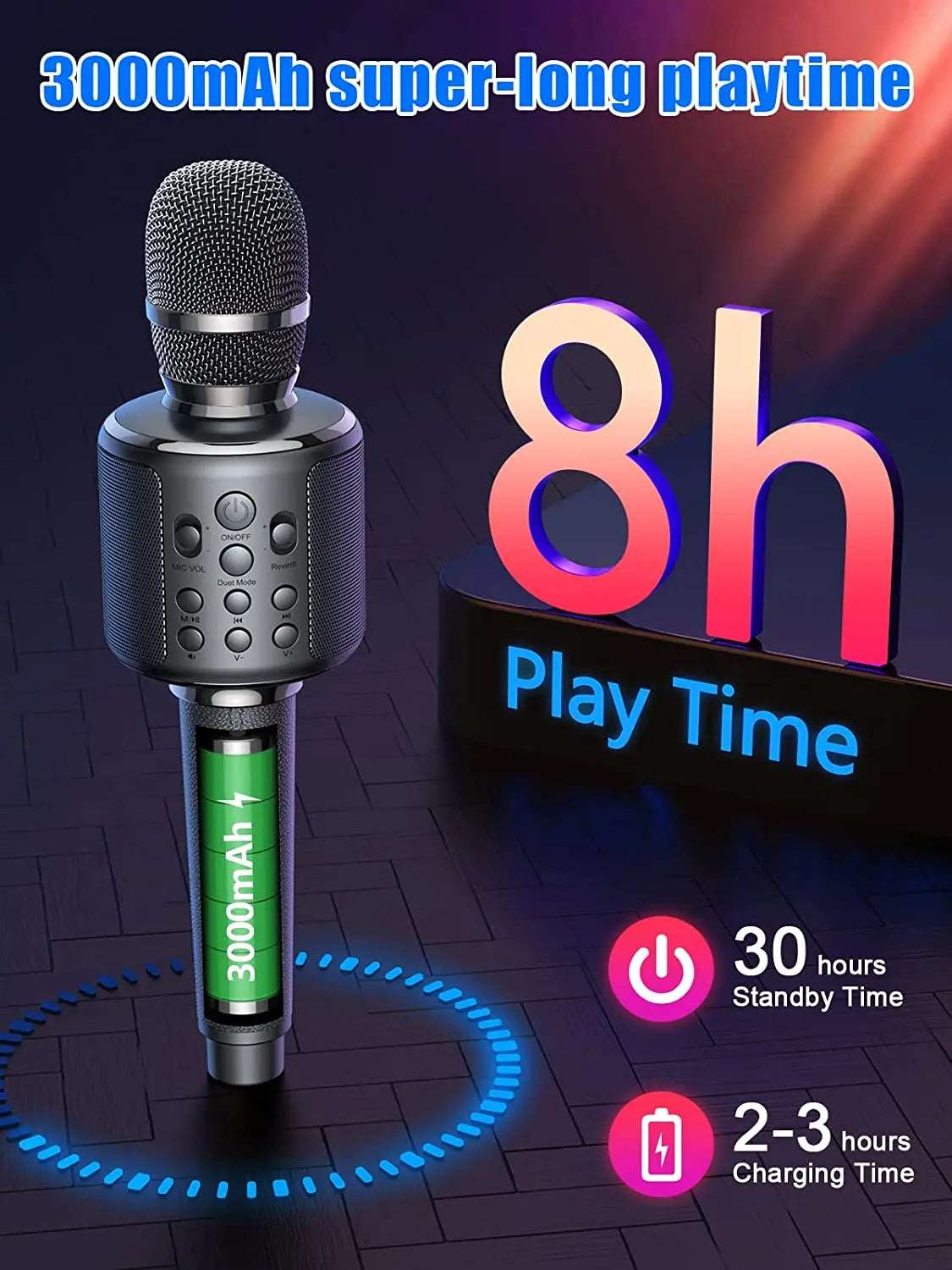 The Karaoke Wireless Microphone has a built-in 3000mAh large-capacity battery, which can last for 8-9 hours of playback time after being fully charged within 3 hours, allowing you to enjoy longer music time!