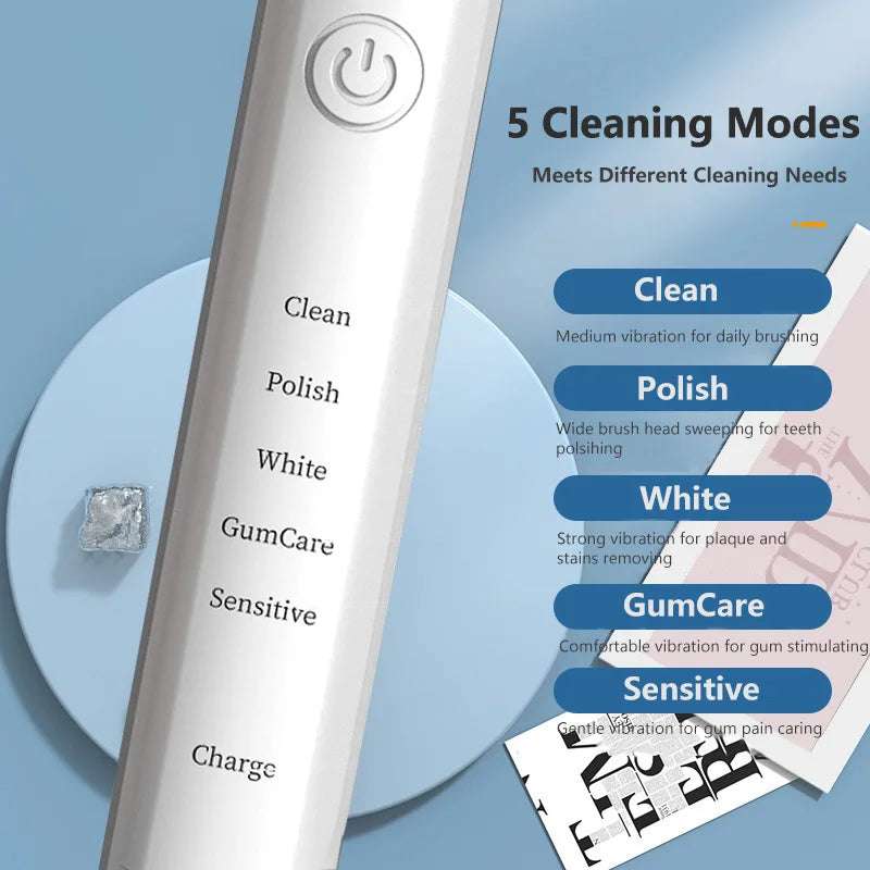 4. There are five intelligent modes for your choice: clean mode for maximized cleaning effect, polish mode for tooth surface polishing and making the teeth bright and clean, sensitive mode for people having sensitive teeth or gums, white mode for people wanting to whiten teeth, gum care mode for gum massaging.